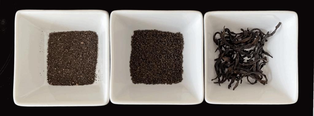 Comparison of a supermarket Earl Gray tea bag content (left), CTC tea (centre, origin: India, but also widely produced in Africa) and loose leaf Phoenix Dancong wulong tea from Chaozhou in Guangdong province, China.